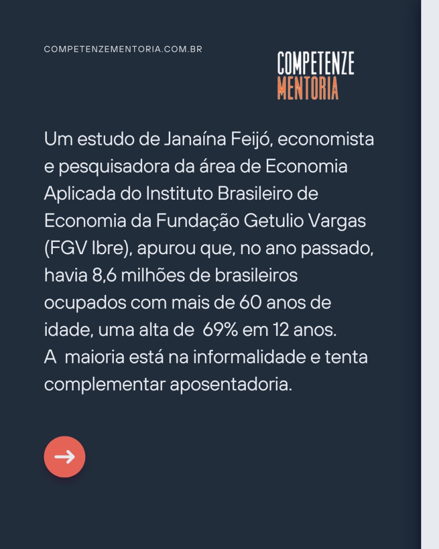 Um estudo de Janaína Feijó, economista e pesquisadora da área de Economia Aplicada do Instituto Brasileiro de Economia da Fundação Getulio Vargas (FGV Ibre), apurou que, no ano passado, havia 8,6 milhões de brasileiros ocupados com mais de 60 anos de idade, uma alta de 69% em 12 anos.
