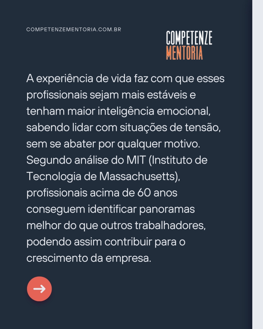 A experiência de vida faz com que esses profissionais sejam mais estáveis e tenham maior inteligência emocional, sabendo lidar com situações de tensão, sem se abater por qualquer motivo. Segundo análise do MIT (Instituto de Tecnologia de Massachusetts), profissionais acima de 60 anos conseguem identificar panoramas melhor do que outros trabalhadores, podendo assim contribuir para o crescimento da empresa.