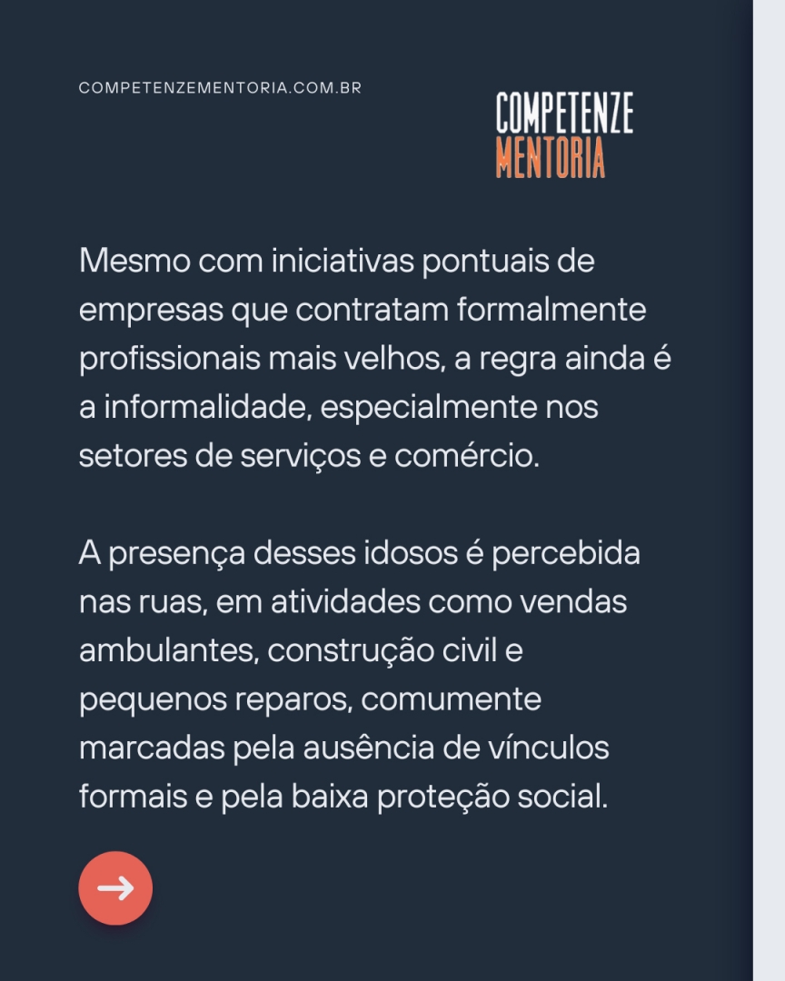 A presença desses idosos é percebida nas ruas, em atividades como vendas ambulantes, construção civil e pequenos reparos, comumente marcadas pela ausência de vínculos formais e pela baixa proteção social.