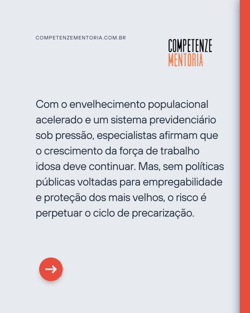 Com o envelhecimento populacional acelerado e um sistema previdenciário sob pressão, especialistas afirmam que o crescimento da força de trabalho idosa deve continuar. Mas, sem políticas públicas voltadas para empregabilidade e proteção dos mais velhos, o risco é perpetuar o ciclo de precarização.